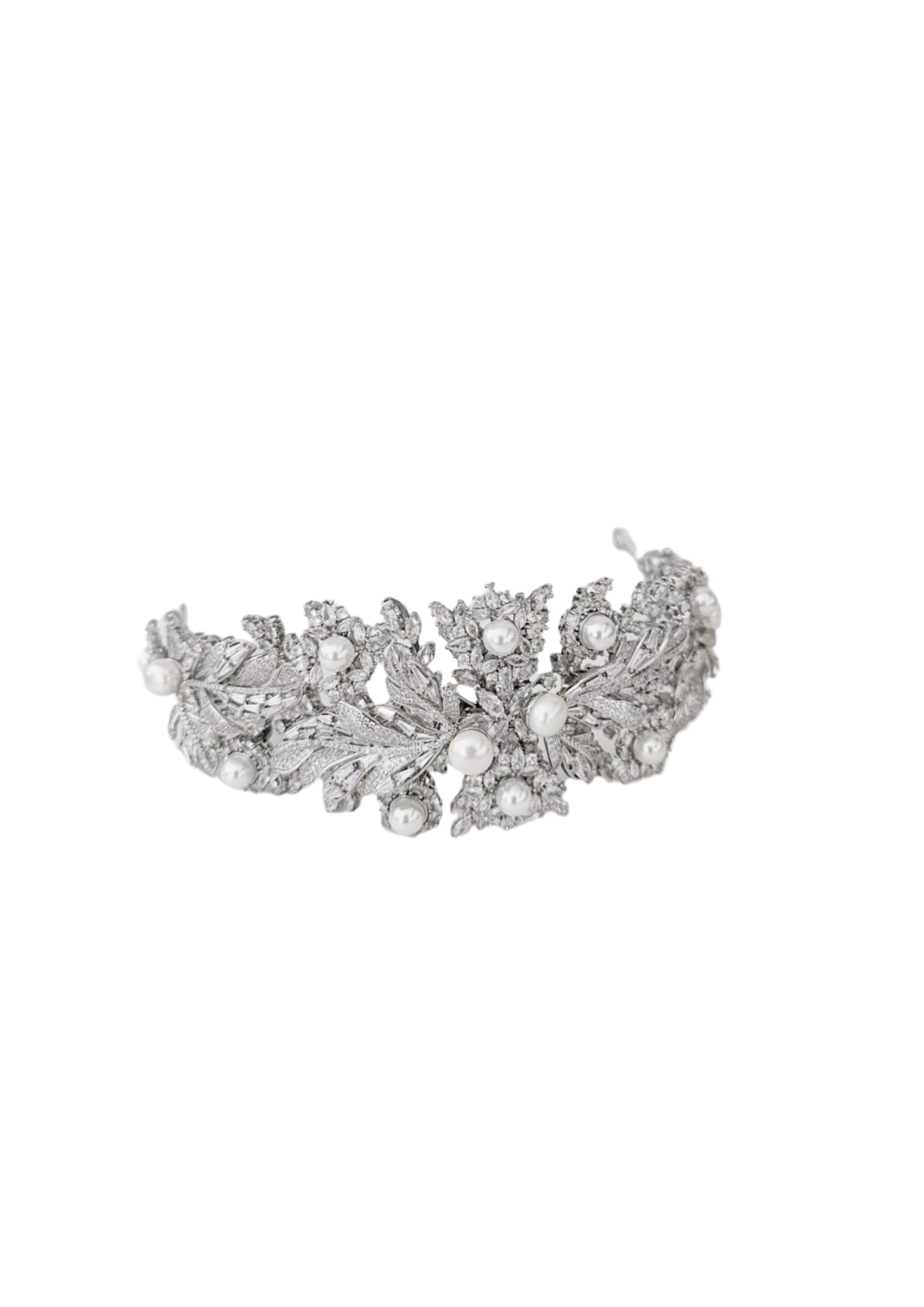 DESCRIÇÃO: A Coroa Verona é uma peça com banho de ródio branco, flores de porcelana fria, pedras de zircônia e pérolas. Seu design maleável permite que seja ajustada de acordo com o penteado desejado.