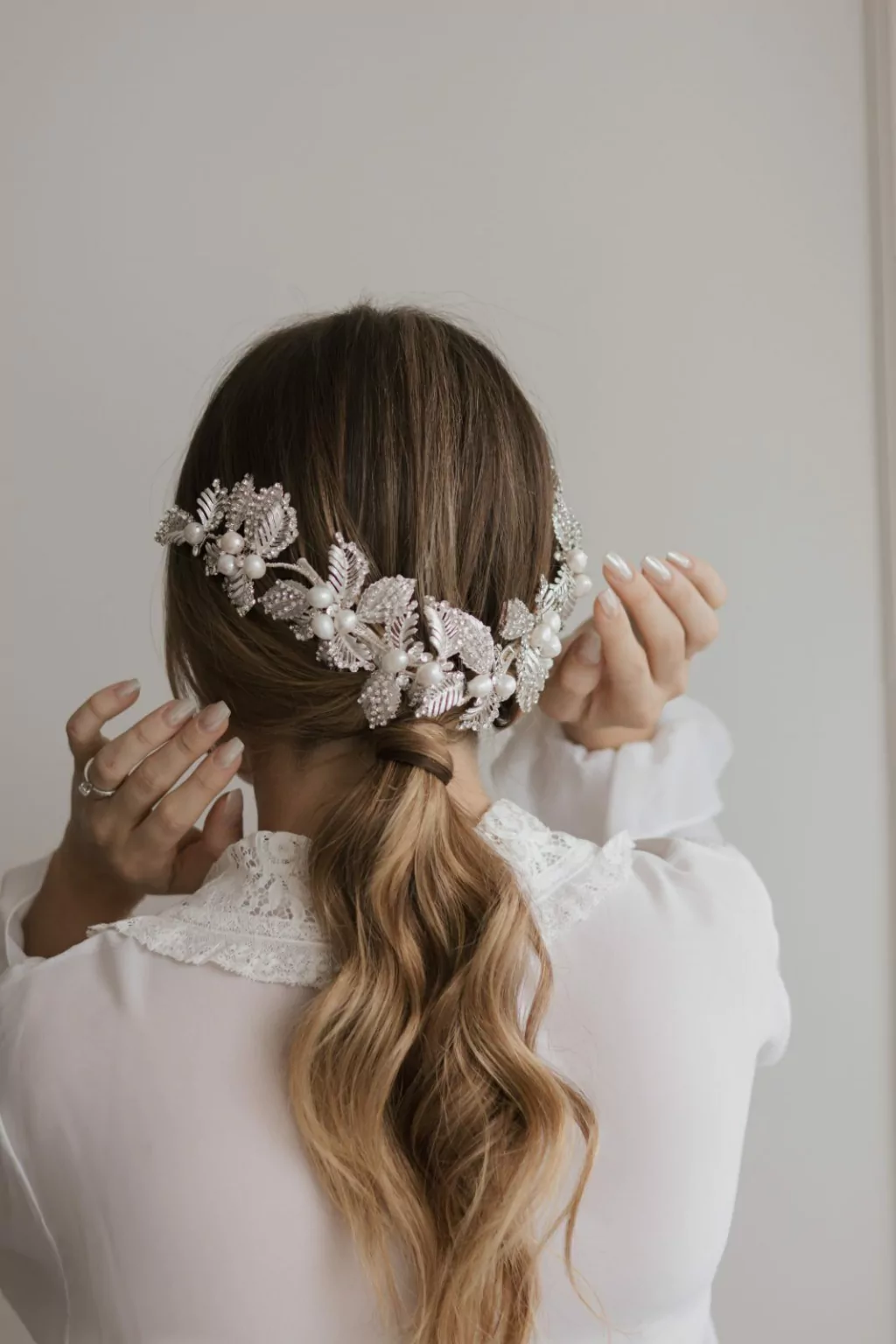 DESCRIÇÃO: O Pente Ciça é uma peça com banho de ródio branco, pedras de vidro e pérolas naturais. Seu design maleável permite que seja ajustada de acordo com o penteado desejado.