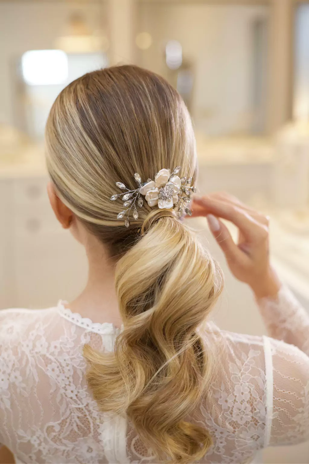 DESCRIÇÃO: O Pente Ofélia é uma peça com navetes e pérolas barrocas. Seu design maleável permite que seja ajustada de acordo com o penteado desejado.