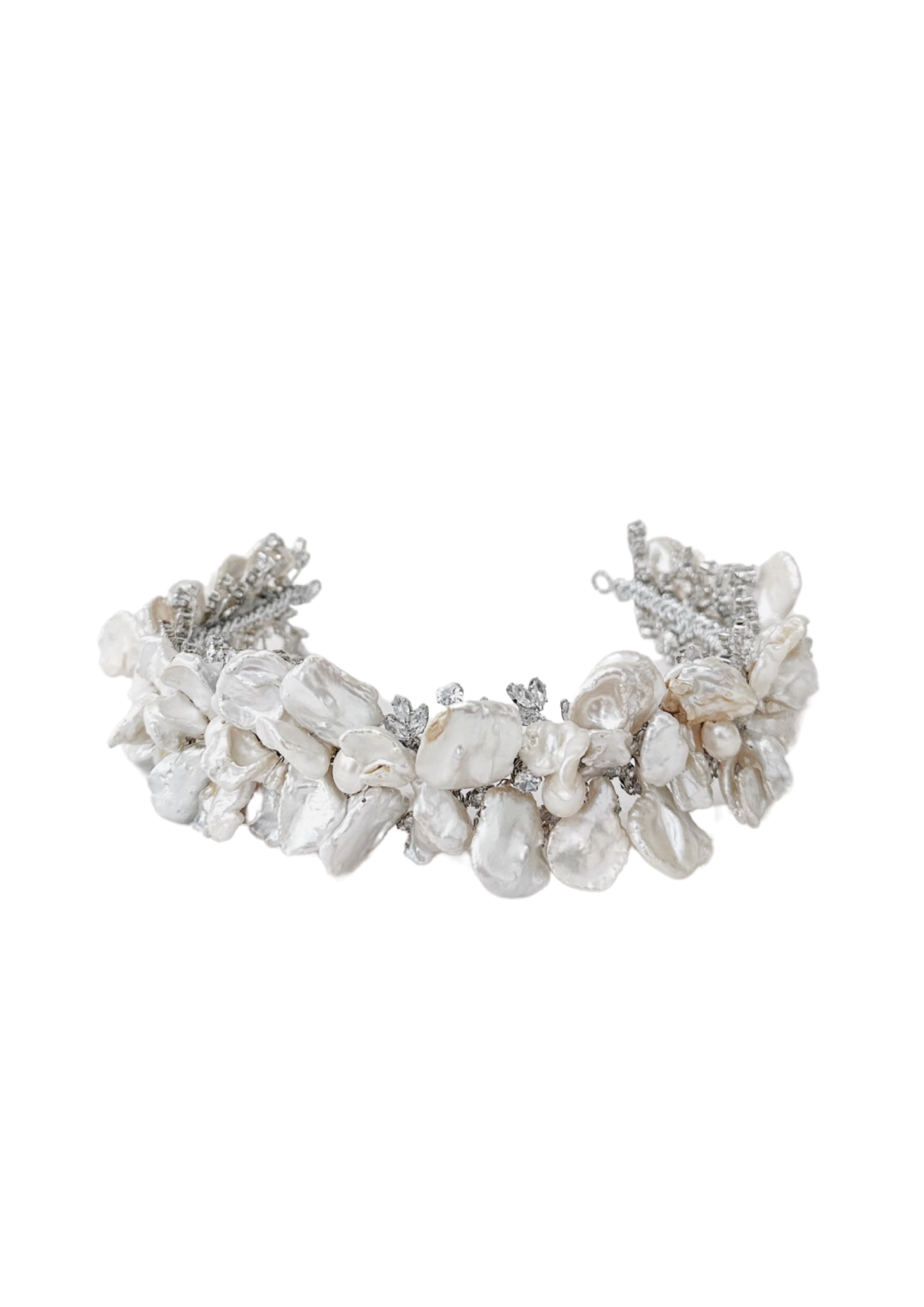 DESCRIÇÃO: A Tiara Pérola Barroca é uma peça com banho de ródio branco, pedras de zircônia e pérolas naturais. Seu design maleável permite que seja ajustada de acordo com o penteado desejado.