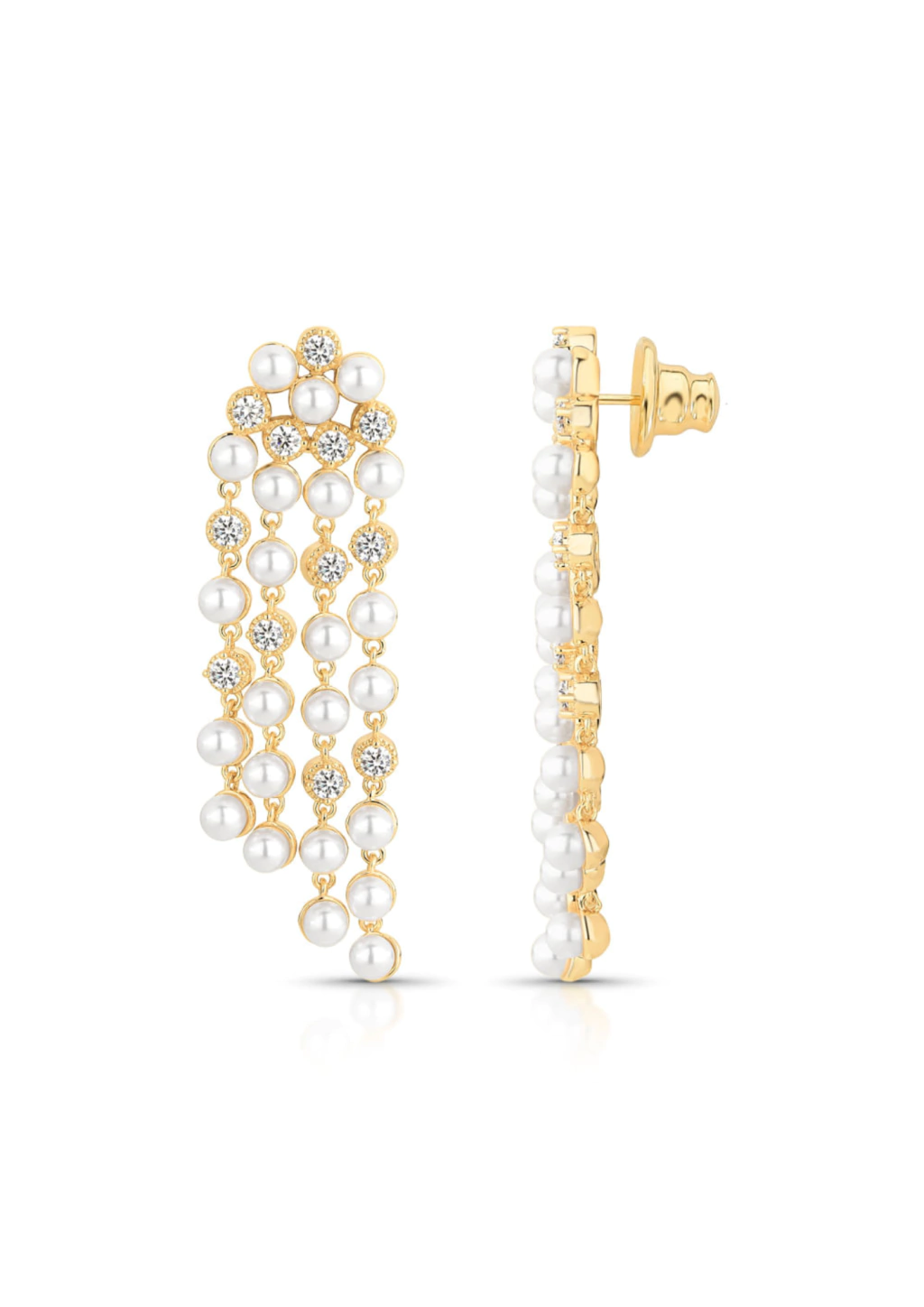 Brinco longo com franjas em alturas diferentes, cravejado com pérolas shell. No banho 18k.